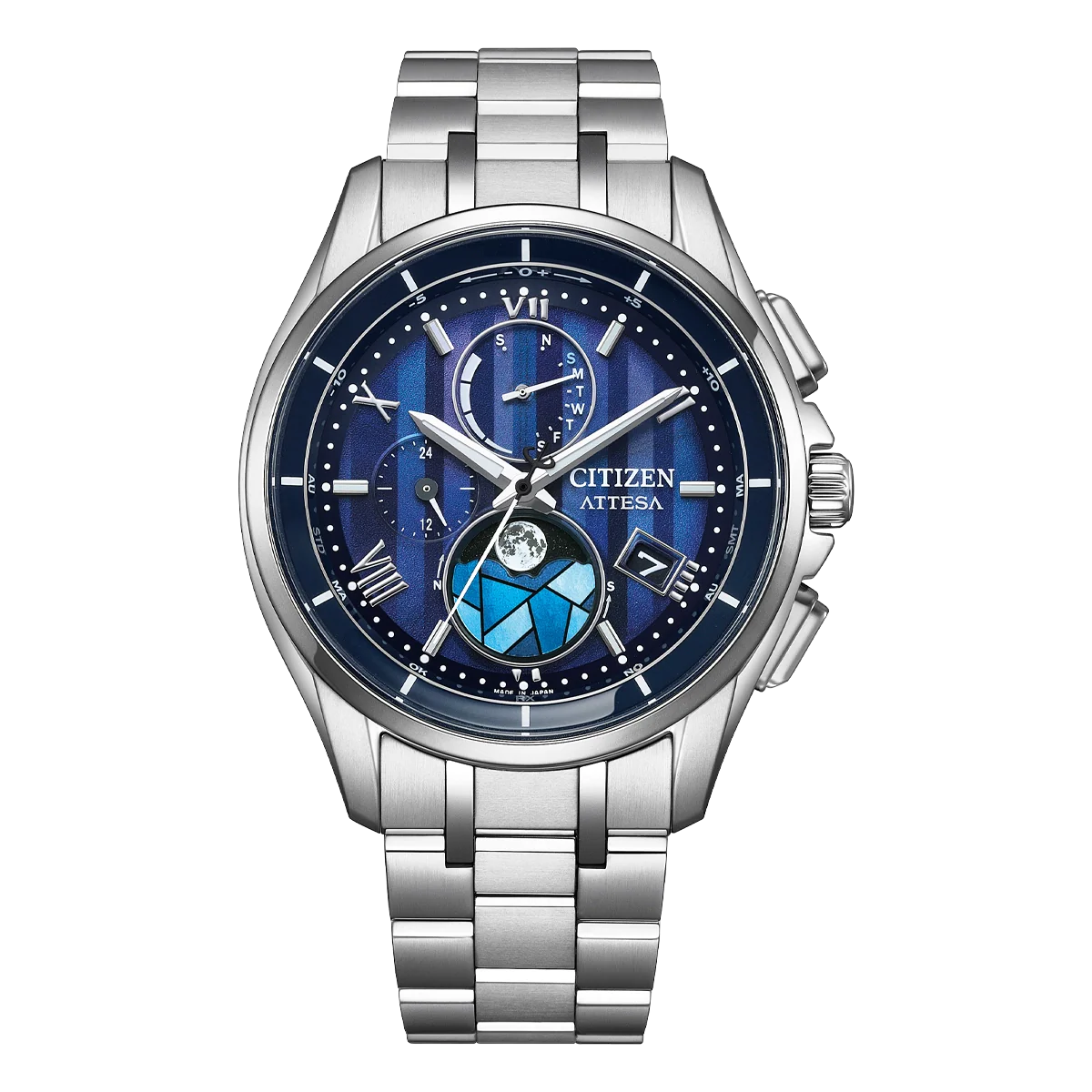 Powerful design and cutting-edge technology have defined ATTESA since its debut in 1987. Built on Citizen’s pioneering expertise in titanium craftsmanship, the collection continues to push boundaries with innovative, world-first advancements that shape the future of luxury watchmaking. The latest release — the limited-edition ATTESA H874 Stained Glass — brings a striking new expression to the elevated luxury sports aesthetic. Its design pays homage to the earliest ATTESA models, featuring a 41.5mm case crafted from scratch- and corrosion-resistant Super Titanium™. Paired with a matching triple-link bracelet, the result is a lightweight yet impressively durable timepiece that immediately commands attention. The special-edition dial is the true centrepiece: a deep interplay of purple, blue, and black inspired by the luminosity of stained glass windows. The effect is both bold and refined, ensuring exceptional legibility without sacrificing style. Beyond its captivating appearance, the watch delivers extensive functionality, including a moon phase display, world time across 24 time zones, a perpetual calendar, and day-date indicators. Powered sustainably by Citizen’s proprietary Eco-Drive technology, it generates energy from light and never requires a battery. Water resistance to 100 meters. Calibre H874. This model is limited to 2,200 unnumbered pieces worldwide. (Please note that the radio-controlled functionality will not work in Australia due to the absence of radio transmitting stations within range. These stations are exclusive to four regions: Europe, USA, China and Japan. However, this does not affect manual time adjustment. Please refer to your instruction manual for guidance.)
