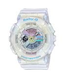 Indulge your fancy with BABY-G watches that offer a swirl of color in a trendy mannish design. Polarized colors dance and float as the viewing angle changes. Indexes and dial components are treated in a polarized finish, with buttons and lettering in pastel pinks, purples, and blues. These creative color schemes soften the fashionable oversized cases and chunky bands for a design that is charming and whimsical.