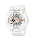 From BABY-G, the casual watch for active women, comes a collection of new models with designs accented with rose gold metallic elements, based on the popular mannish design BA-110. These models are available in a choice of standard black or white, or popular pastel pink coloring for the case and band. The main color is accented by cool rose gold color metallic parts that add a distinctively feminine touch to the basic mannish design. These new models are sure to become standard items in the world of autumn and winter street fashions.