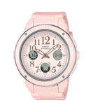 From the popular wide face BGA-150 Series, comes new models with brilliant Arabic numerals for hour markers. The black model features a gold ion-plated bezel giving it a look of quality that is a step above the rest. The pastel pink, and white model incorporates pink gold Arabic hour marker numbers for an elegantly feminine color motif. Three digital dials provide information about the date, World Time, stopwatch timing, and more. Feminine designs that coordinate well with female fashions, along with practical features and functions, and easy readability.