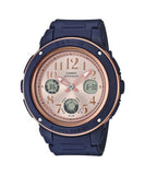 Presenting new dark color navy blue and brown additions to the lineup of casual BABY-G watches that coordinate well with autumn colors. Subdued navy blue and brown base colors for the case and band combine with simple styling designed to fit in with various fashions. Accents provided by pink gold coloring for hour markers, the face, and bezel ring add a touch of brilliance to these designs. The bezel ring has an ion-plated (IP) finish for an elegant look. The base model for this series is the BGA-150, which incorporates a large face into a slim-sized timepiece. The pink gold accents of this new BABY-G series create a look that is suitable for wear with a wide range of fashions.