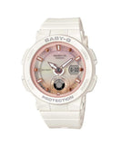Introducing a new Beach Traveler Series of summer themed models from BABY-G, the casual watch for active women. Part of a series based on a theme that highlights the beauty of a summertime beach, these models are available in a choice of four attractive colors: the translucent blue of the ocean, the pink of the twilight sun reflecting off the water, the white of the beach sand, and the black of a summer night enveloping the beach. The edge of the face uses semitransparent material, which reproduces the sparkle of ocean water. The hour and minute hands are designed in the image of the helm and anchor of a boat, further adding to the overall beach activity motif. Bar shaped hour markers round out the simple design of the face. Neon Illuminator uses black light, which causes face elements to glow for easy reading. Turning on illumination causes the hands to glow hues that create the illusion of the night-time ocean. These new BABY-G models are just the thing for a wide variety of summertime travel and beach activities.