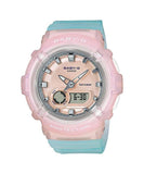 The BGA-280 Series layers multiple parts to create innovative and colorful designs. The round cases of these models and the cute impression of their hefty forms are complemented by the sporty touch of the metallic hour markers. The pastel colors of these models are all inspired by LA street designs. Case colors are offset by mint green, ivory and semitransparent blue and semi-transparent purple base colors to create refreshingly attractive designs.