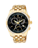 This Citizen Eco-Drive men's watch from our Perpetual Calendar Collection is luxurious and elegant. The velvet black dial displays grey and white features with gold-toned highlights, while 36 carefully selected, handset diamonds sparkle atop the bezel. Dial features include an alarm, dual time, 12/24hr time, perpetual calendar, day, date and month. The gold-toned durable stainless steel casing and soft-edged bracelet complete this stunning accessory, while the non-reflective glass coating, 18-month power reserve, low-charge indicator and water resistance suitable for water sports or wearing in the surf ensure that whether you're working or playing, you always have time.