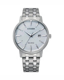 A modern timepiece that displays classic aesthetic appeal. The looks of this watch are equally matched by its reliability. A smooth silver sleek dial and stainless steel bracelet. Features include Date, push button buckle and low charge indicator. Powered by our Eco drive, never needs a battery, only a light source.