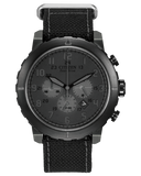 Stand at attention with this rugged military-inspired chronograph timepiece with slip-thru canvas straps with metal rings that keep the watch in place. In a stealthy black-on-black theme of stainless steel with a black strap and dial. Additional features include a 1/5-second chronograph that measures up to 60 minutes, 12/24-hour time and date. Featuring our Eco-Drive technology – powered by light, any light. Never needs a battery. Caliber number B620.