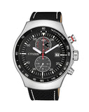 In addition to accuracy ensured via the chronograph, the performance of this watch is powered by Eco-Drive, obtaining energy from any light source and eliminating the need for batteries. Featuring WR100 with a multi dial as well as date display. Constructed with stainless steel with a black dial as well as the black leather strap, this watch is as sharp on looks as it is on performance. Caliber number B642.