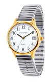 Divine Classic ladies gold tone watch features white dial with Arabic numbers and date.