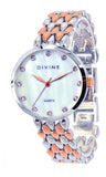 Divine Classic ladies rose two tone watch features sparkling crystals on mother of pearl dial.