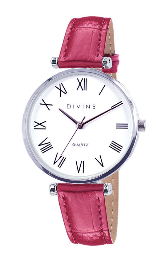 The Ladies Watch features a White dial. housed in a Silver case that radiates classic charm. The Croco leather band in Hot Pink adds a touch of sophistication while ensuring durability and comfort. It fastens securely with a Pin Buckle clasp, providing a reliable fit for any wrist size. This timepiece blends functionality with elegance, making it a perfect accessory for both everyday wear and special occasions.