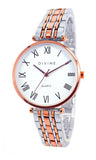 Divine Classic ladies rose two tone watch features white dial with Roman numeral.