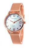 Divine ladies rose tone watch features mother of pearl dial with date.