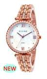 Divine classic ladies rosegold watch Mother of Pearl dial features sparkling round crystals on the bezel.