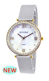 Divine classic ladies two tone gold watch Mother of Pearl dial features sparkling round crystals on the bezel.