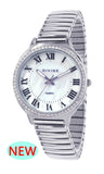 Divine classic ladies silver watch Roman Numeral on Mother of Pearl dial features sparkling round crystals on the bezel.