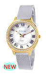 Divine classic ladies two tone gold watch Roman Numeral on Mother of Pearl dial features sparkling round crystals on the bezel.