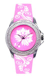 DW ladies silver and pink tone watch features shining small round crystals on the bezel. Pink dial with floral print.