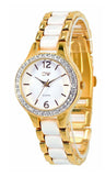 DW ladies gold tone small size watch with white dial features clear round crystals on the bezel.