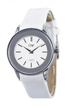 DW ladies silver tone watch with white dial on white leather band.