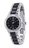 DW ladies silver tone small size watch with black dial features clear square crystals on the bezel.