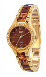 Band is tortoise polycarbonate set in the middle of gold bracelet.