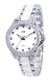 Band is white polycarbonate set in the middle of silver bracelet with self-adjustable links.