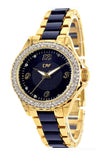 Band is black polycarbonate set in the middle of gold bracelet with self-adjustable links.