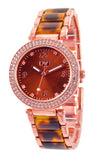 Band is tortoise polycarbonate set in the middle of rose bracelet with self-adjustable links.