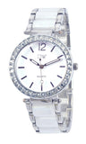 DW ladies silver tone watch with white dial features shining clear square crystals on the bezel.