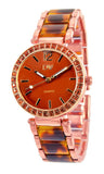 Band is tortoise polycarbonate set in the middle of rose bracelet with self-adjustbale links.