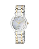 Reflecting devotion to pure quality in craftsmanship, 6 shimmering diamonds radiate grace and sophistication from a stylishly functional watch. The luxury of this watch is subtly durable, as hardy white and gold plated stainless steel case to delicately house a unique dial interspersed with diamonds. Equipped with Eco-Drive, it obtains power from any light it is exposed to, highlighting the carefully considered approach taken in building a watch that leaves a lasting impression. A limited edition from the L Collection, this watch is designed to help you celebrate every second of your life in lavish style.