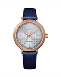Make room in your watch collection for this modern timepiece. A fresh staple to your every day watch wearing with clean lines and simplistic detailing. Featured here in a sleek blue leather strap, pink gold case and a unique checkered patterened silver tone dial. Always be on trend wearing this model. Powered by our Eco-drive technology, never needs a battery, only a light source.