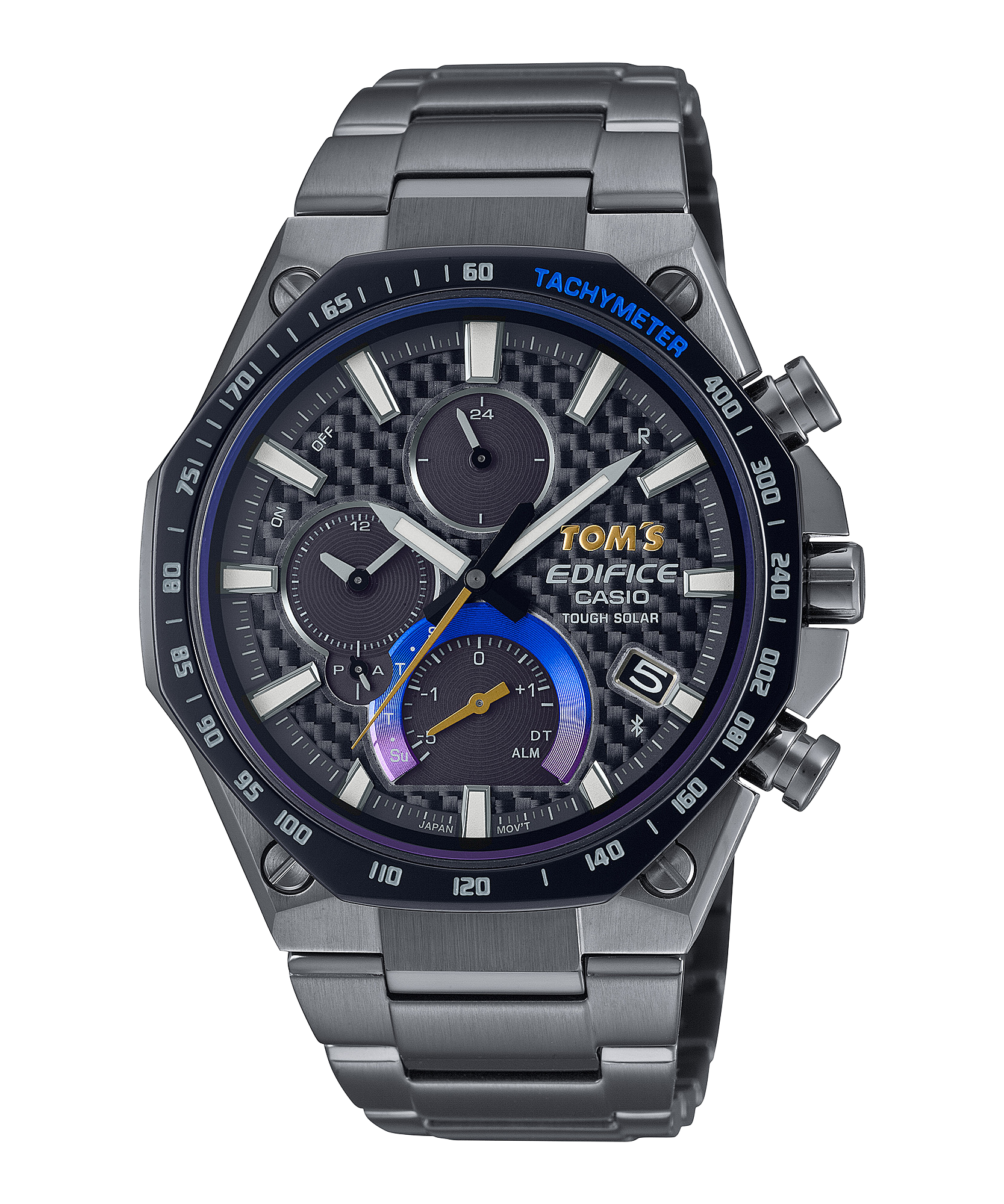 TOM’S and EDIFICE logos adorn the dial together in a pair at the 3 o’clock position, with the gold colour of the TOM’S logo giving a luxurious gleam. Logos are engraved in the case back and clasp as well. The watches are presented in special packages featuring carbon weave designs.
