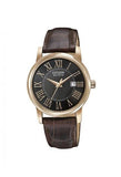 Rose gold-tone stainless steel case with a brown leather strap. Fixed rose gold-tone bezel. Brown dial with rose gold-tone hands and Roman numeral hour markers. Minute markers around an inner ring. Dial Type: Analog. Luminescent hands and markers. Date display at the 3 o'clock position. Scratch resistant mineral crystal. Pull / push crown. Solid case back. Case diameter: 31 mm. Case thickness: 8 mm. Round case shape. Band width: 16 mm. Tang clasp. Water resistant at 30 meters / 100 feet. Functions: date, hour, minute, second. Casual watch style. Citizen Eco-Drive Brown Dial Brown Leather Ladies Watch EW1569-01E.
