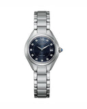 Feminine curves, uninterupted design and technical expertise are all showcased in this original timepiece. Crafted with SWAROVSKI® elements on a dark navy blue dial. This simple yet classic model is effortless and the perfect choice for day or evening. Powered by our Eco-drive technology, never needs a battery, only a light source.