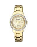 Comfortable luxury is always on hand with this stunning watch. Accurate to within 15 seconds over the span of each month, it is as reliable as it is beautiful. The gold tones Ð highlighted by a tasteful gold accented dial Ð are elevated by a bezel enveloped in lavish Swarovski elements to create a look that is stylishly elegant without being excessive.