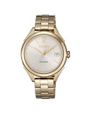 As part of Citizen Ladies Dress Collection, fashionable, precise and powered by light, creates an appeal unlike any other. Featured in rose gold-tone stainless steel case and bracelet with a champagne dial. Featuring our Eco-Drive technology – powered by light, any light. Never needs a battery. Caliber number J810.