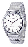 Grandeur Classic silver gent watch features white dial with Roman numeral and date.