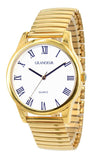 Grandeur Classic gold gent watch features white dial with Roman numeral and date.