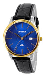 Grandeur Classic gold two tone gent watch features blue dial with baton markers and date.