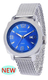 Grandeur classic and extra large silver gent watch features blue dial with mesh pattern on the bezel with Arabic numbers and date.