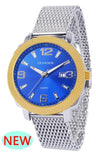 Grandeur classic and extra large twotone gold gent watch features blue dial with mesh pattern on the bezel with Arabic numbers and date.