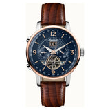 The distinctive blue dial is complimented by a balance wheel located right above the 6 o’clock mark. The automatic movement is contained in rose gold /silver casing giving the watch its character and personality.