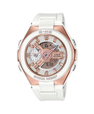 From the BABY-G G-MS lineup of watches for the active and sophisticated woman of today comes a selection of brilliant design models. The generous use of gold and pink gold colour metal parts creating a collection of models that add a touch of brilliant charm to the feminine wrist. Metal is also used for the face rings, band ring, buckle, and metallic gear-like face. Function-wise, these models come with Dual Dial World Time, which shows the current time in another time zone using a small dial at 9 o'clock. All of this and much more provides plenty of support for the world-travelling woman on the go.