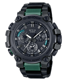 The MTG-B3000BD features a layered composite band made of hollow stainless steel segments encasing fine resin parts for a lighter weight band. Ion-plated metal components bring a touch of fresh color to the overall chic black design.
