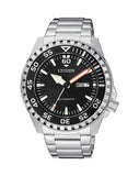 Soar to new heights with this modernized timepiece from our Mechinical Collection. Its modern and contemporary design reflects great craftsmanship and enduring quality. Its sleak black dial, Day/Date, stainless steel case and bracelet compliment its pure and appealing aesthetic.