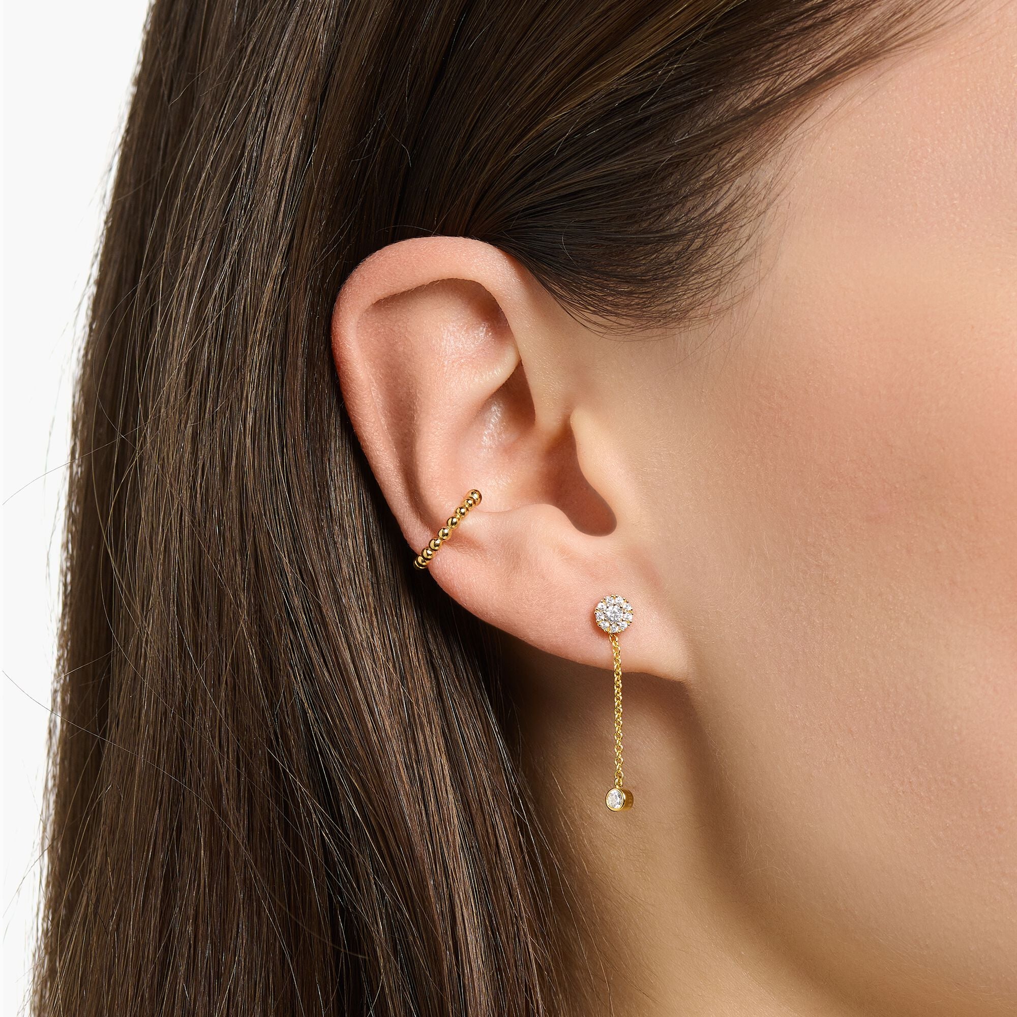 Perfect for the curated ear trend: the single stud earring made from high-quality 925 Sterling silver is adorned with sparkling stones in a classic style. A faceted white zirconia stone in the centre is surrounded by smaller ones in filigree lobster settings. The design with a 18k yellow gold plating is a must-have and perfect for creative combinations.